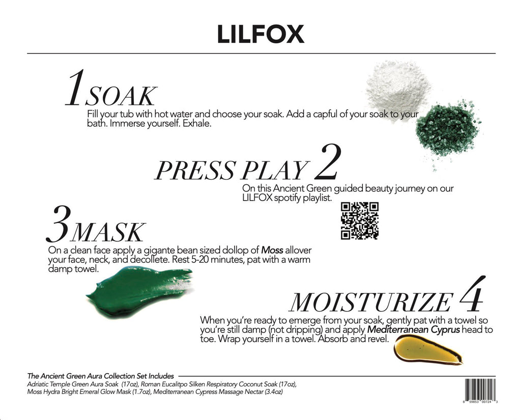 Master Auric Aesthetician Mikaela is back with a new guided journey that perfectly completes the ancient green portal. Find the exclusive QR code on the special, complimentary box companion card with instructions on how to use all the products. Press Play and prepare to gracefully trip into realm of green serenity; LILFOX style.